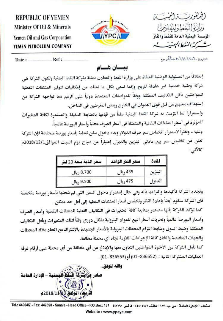 أعلنت شركة النفط اليمنية اليوم تخفيض مادتي البنزين والديزل تماشيا مع سعر الصرف في السوق المحلية.