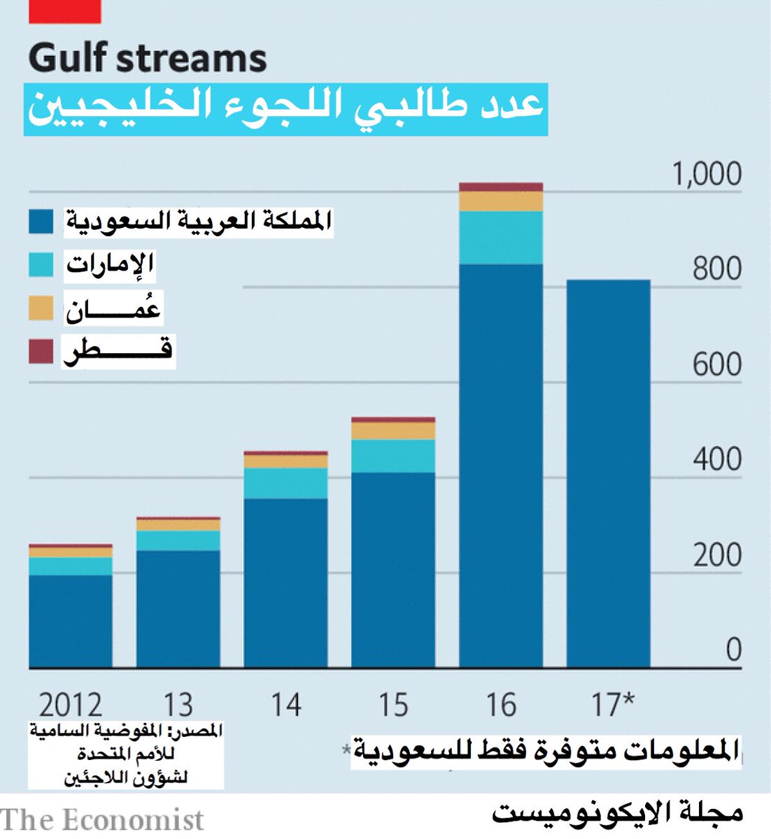 وقالت المفوضية إن عدد طالبي اللجوء السعوديين تضاعف في عام 2017 بنسبة 318% مقارنة في عام 2012 وفقا لمجلة “إيكونوميست” البريطانية.