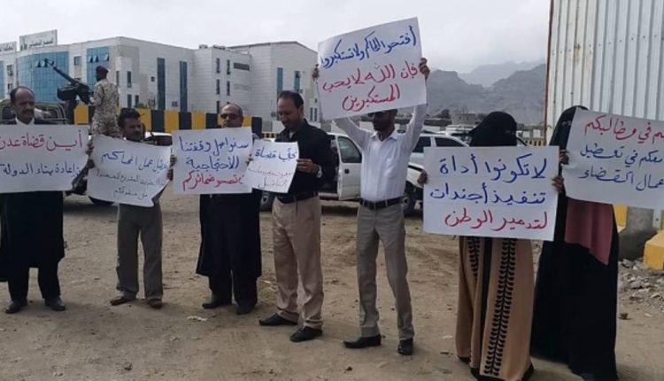 نظمت نقابة المحاميين فرع عدن صباح اليوم الأربعاء وقفة احتجاجية أمام المجمع القضائي للتنديد باستمرار تعطيل عمل النيابات والمحاكم في المحافظة الخاضعة لسيطرة الإمارات منذ أربع سنوات.