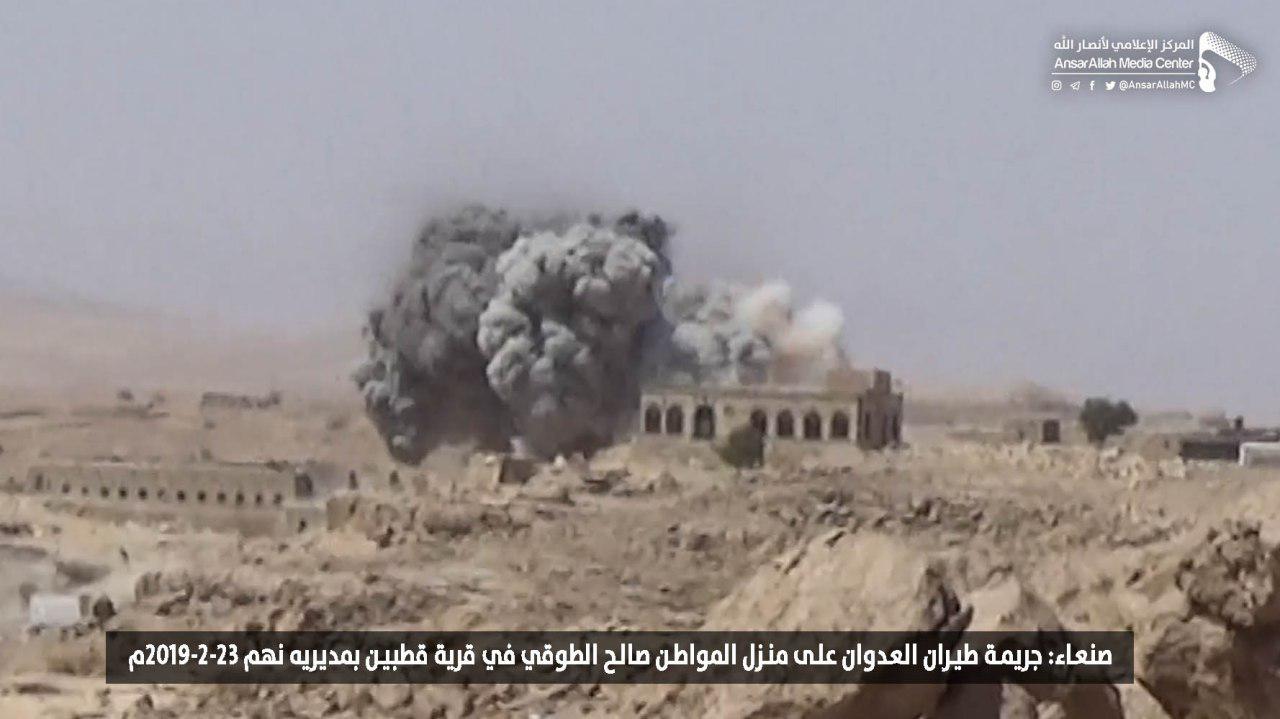 وفيما يلي صور الضحايا والدمار لجريمة طيران التحالف التي استهدفت منزل المواطن صالح محمد الطوقي في قرية قطبين بمديريه نهم والتي اسفرت عن مقتل ثلاث نساء ومسن.