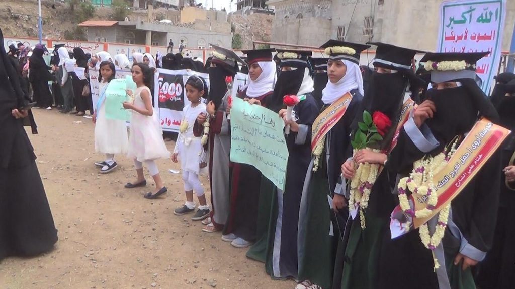 المشاركات في الوقفة النسائية في مديرية جبلة، الخميس، خاطبن جميع اليمنيين الأحرار وقبائل اليمن وطالبنهم بـ “الإنتصار لمظلومية الطالبات الضحايا والهبة الشعبية لرفد الجبهات بالمال والرجال والعتاد دفاعا عن اليمن”.