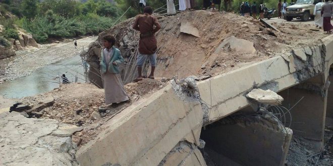مسؤول أمني أكد أن طيران التحالف استهدف بـ3 غارات جوية جسر شعلان الواقع في الخط العام بمديرية حوث في محافظة عمران ما اسفر عن تدمير الجسر بالكامل ، واستهدف بغارة أخرى أحد المزارع في منطقة غول ساري بمدينة حوث بذات المحافظة خلفت أضرارا كبيرة بالمزرعة.