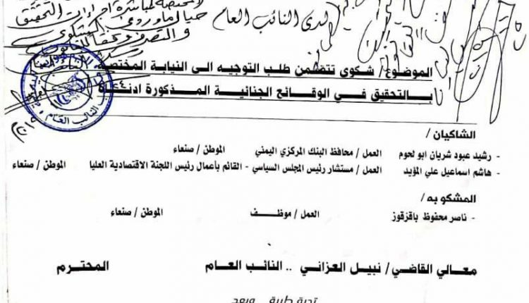 ونص توجيه النائب العام المحرر، الأحد، على شكوى مستشار رئيس المجلس السياسي الأعلى هاشم إسماعيل علي ومحافظ البنك المركزي اليمني في العاصمة صنعاء الدكتور رشيد أبو لحوم، بأن يتم “الاطلاع على الشكوى والتحقيق فيها والتصرف وفقا للقانون”.