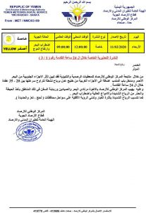 وحصلت “وكالة الصحافة اليمنية” على نسخة من النشرة التحذيرية الخاصة لمركز الأرصاد فيما يلي نصها: