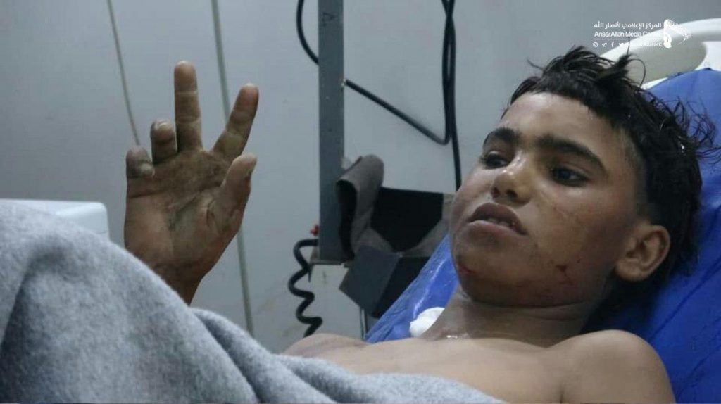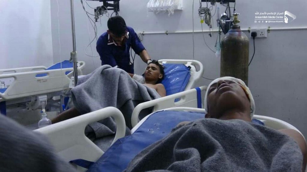 ونشر المركز الإعلامي لأنصار الله، صورا للضحايا يتلقون الاسعافات الاولية في احد المراكز الطبية، وتبين الحالة الحرجة لاثنين من الاطفال المصابين بالغارات.