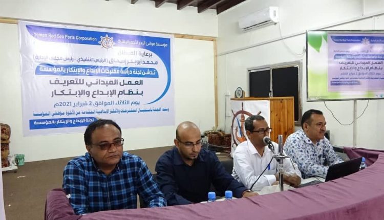نظمت لجنة الإبداع والإبتكار بمؤسسة موانئ البحر الأحمر اليمنية اليوم اللقاء التعريفي الثاني الخاص بمهام وأهداف اللجنة التي جرى تشكيلها مؤخرا بالمؤسسة في اطار التنفيذ العملي للرؤية الوطنية لبناء الدولة اليمنية الحديثة وبهدف تحسين استخدام الموارد وتحقيق نتائج افضل مقارنة بالفترة الماضية.