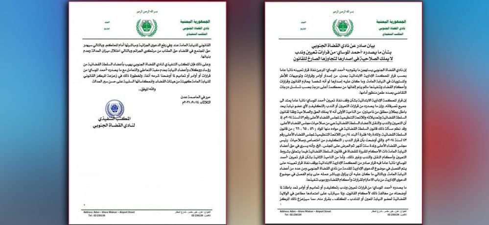 أكد نادي القضاة الجنوبي أن أنشطة النائب العام المعيَّن من قِبل هادي “أحمد الموساي” تمثل مخالفة لأحكام وقرارات قضائية صادرة بشكل قانوني.