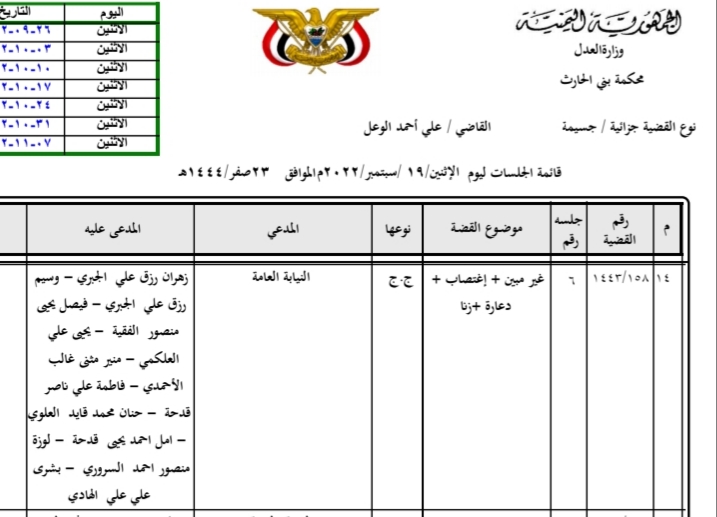 حددت محكمة بني الحارث الابتدائية بأمانة العاصمة يوم غد الإثنين موعد جلسة محاكمة المتهمين في واقعة اغتصاب ثلاث شقيقات في صنعاء.