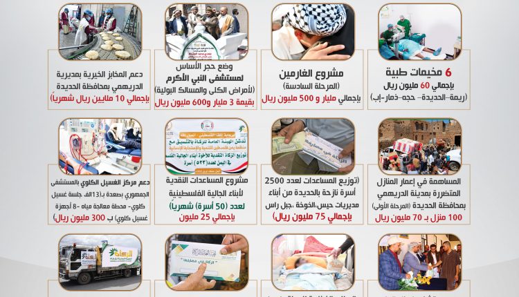 وشملت أيضاً ، المساهمة في إعمار المنازل المتضررة بمدينة الدريهمي في محافظة الحديدة “المرحلة الأولى” ١٠٠ منزل بقيمة ٧٠ مليون ريال ، وإقامة ٦ مخيمات طبية بمحافظات “ريمة ، الحديدة ، حجة ، ذمار ،إب ” بإجمالي ٦٠ مليون ريال ، ومشروع المساعدات النقدية لأبناء الجالية الفلسطينية بتكلفة ٢٥ مليون ريال  ، ومشروع دعم رعاية الايتام بأمانة العاصمة بإجمالي ٢٠ مليون ريال ، إلى جانب مساعدات نقدية لعدد ٢٠٠ اسرة نازحة من أبناء محافظة شبوة بإجمالي ١٠ ملايين ريال ، ودعم المخبز الخيري بمديرية الدريهمي بمحافظة الحديدة بإجمالي ١٠ ملايين ريال ، وغيرها من المشاريع الخيرية.