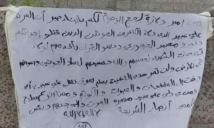 ووزع فرع التنظيم في المحافظة بيان لأمير الولاية يتوعد فيه الشيخ علي عبيد العزيبي ، ابرز مشايخ مديرية صبر، بالمفخخات والكواتم والعبوات الناسفة ..كما يهدد انصار العزيبي، ويتهم التنظيم العزيبي بمولاة من وصفهم بـ”الحوثيين” .