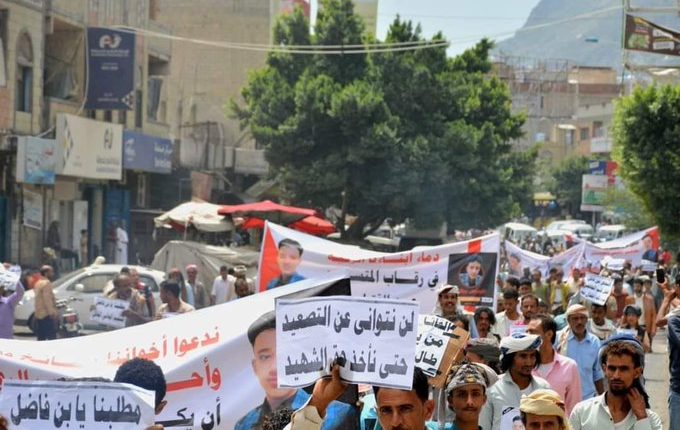 ورفع المحتجون، لافتات طالبت قائد محور تعز “خالد فاضل” بتسليم القاتل كتب عليها: “مطلبنا يا أبن فاضل.. تسليم الجاني القاتل” وعبارة “لن نتواني عن التصعيد حتى نأخذ حق الشهيد”.