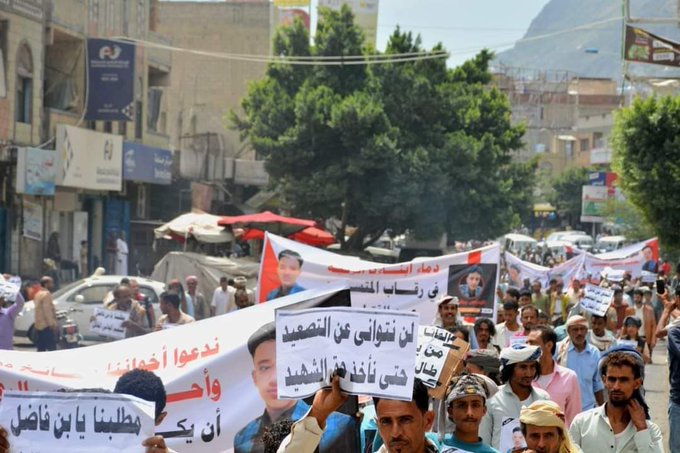 وأفادت مصادر محلية، أن المئات من أبناء مديرية جبل حبشي ـ التي ينتمي لها الطفل الضحية ـ تجمعوا مع المئات من أبناء مدينة تعز نفذوا مسيرة انطلقت من أمام بوابة نادي الصقرفي حي بير باشا باتجاه مقر السلطة المحلية التابعة للتحالف في شارع جمال.