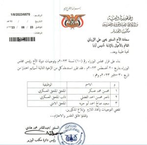 وأكدت وثيقة صادرة عن الحكومة انها انهت عمل الملحقين العسكريين ونوابهم ومساعديهم بينهم نجل وزير الدفاع السابق بالحكومة “هشام محمد علي المقدشي” الذي يعمل نائبا للملحق العسكري في واشنطن، دون صرف مستحقاتهم منذ الأشهر السابقة.