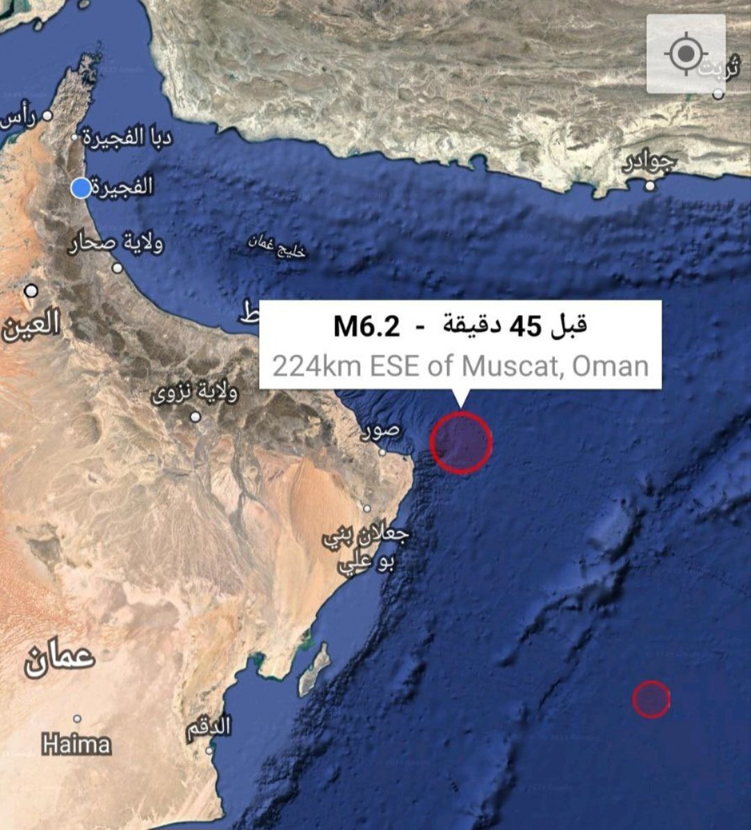 ضرب زلزال بحري اليوم السبت بحر العرب بقوة بلغت قوته 6.2 ريختر قبالة ساحل منطقة صور في سلطنة عمان.