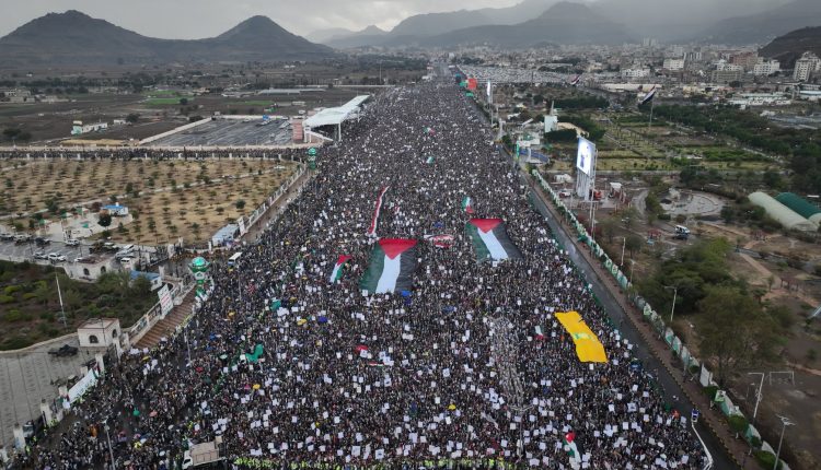 أعلنت الجماهير المليونية المتدفقة اليوم الجمعة إلى ساحة ميدان السبعين في أمانة العاصمة صنعاء وبقية المحافظات اليمنية تأكيدها على موقفها المساند للشعب الفلسطيني، مجددة رفضها المطلق للعدوان الأمريكي البريطاني على اليمن أرضا وإنسانا.