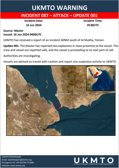 اليوم الأحد، أفادت هيئة عمليات التجارة البحرية البريطانية “UkMTO”، في بيان على منصة “إكس”، بأن سفينة أبلغت اليوم عن وقوع انفجارين بالقرب منها، على بعد 40 ميلا بحريا قبالة سواحل مدينة المخا اليمنية.