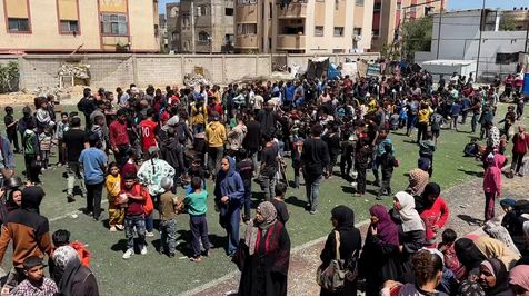 في مخيم النصيرات وسط قطاع غزة، يتجمع مئات النازحين الفلسطينيين، أمام “مطبخ خيري” للحصول على وجبة طعام بعد انتظار طويل.