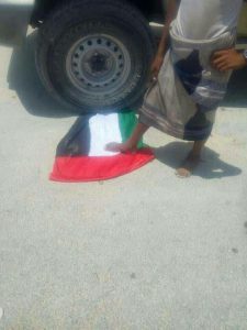 ونشر ناشطون من أبناء المحافظات الجنوبية صورا لأبناء المحافظات الجنوبية وهم يدوسون العلم الإماراتي بأقدامهم في المكلا وعدن.