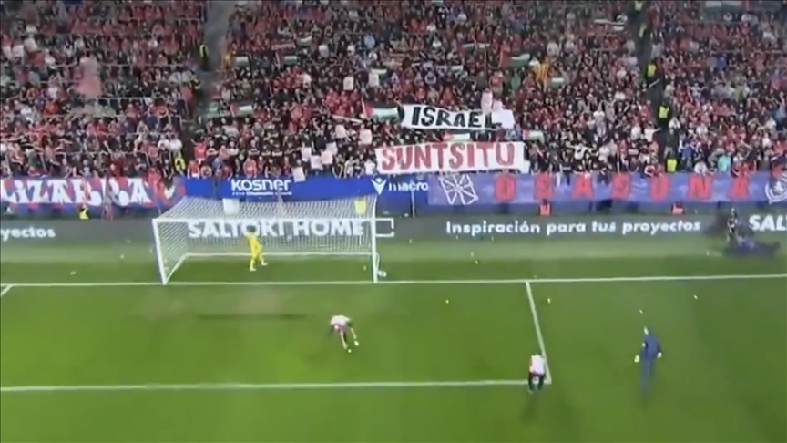 ورافق تصرف مشجعي أوساسونا لافتة كتب عليها “إسرائيل سنتسيتو” (دمّر إسرائيل) باللغة الباسكية، كما رددوا هتافات داعمة لفلسطين ومناهضة لإسرائيل، في إشارة لرفضهم حرب الإبادة التي تشنها إسرائيل على قطاع غزة على مدار عامين.