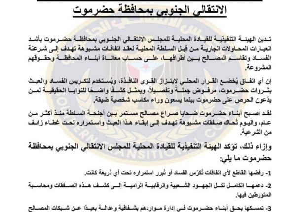 وقال الانتقالي في بيان له إن “تحركات السلطة المحلية، تمثل كشفا واضحا للنوايا الحقيقية لمن يدعون الحرص على حضرموت بينما يسعون وراء مكاسب شخصية ضيقة”، في إشارة منه إلى الاتفاق الأخير بين السلطات و”حلف قبائل حضرموت”.