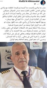 وذكر “خالد” نجل الكابتن المتوكل، في منشور له على مواقع التواصل الاجتماعي، أن عملية الاختطاف جرت في اللحظات الأخيرة قبل إغلاق أبواب الطائرة.