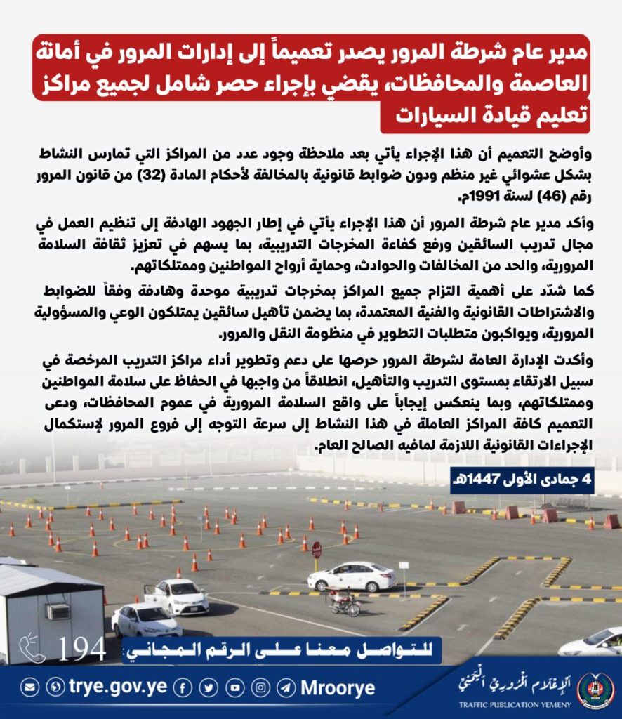 شرطة المرور في صنعاء تصدر تعميم هام لجميع مراكز تعليم قيادة السيارات
