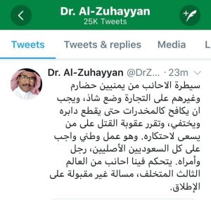 وأعتبر المغرد السعودي “د. الزهيان”، أن مكافحة سيطرة التجار “الحضارمة” اليمنيين على السوق التجارية في المملكة هو ” عمل وطني واجب على كل السعوديين الأصليين، رجل وأمرة”.