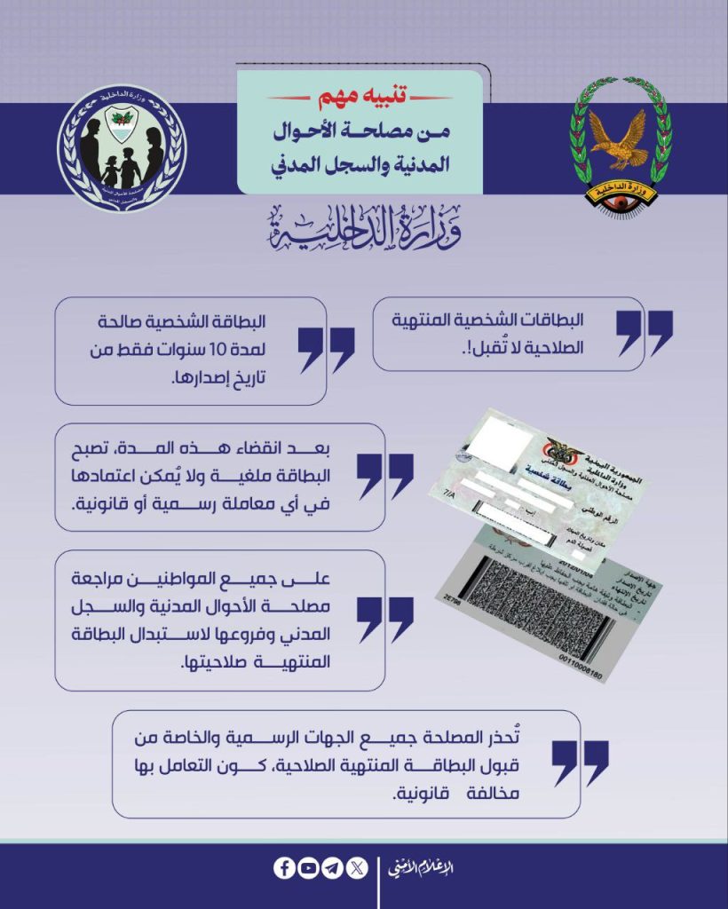 وأكدت المصلحة في التعميم، حصلت “وكالة الصحافة اليمنية” على نسخة منه، أن البطاقة الشخصية المنتهية الصلاحية ملغية، بعد انقضاء مدة 10 سنوات من تاريخ إصدارها، ولا يمكن اعتمادها في أي معاملة رسمية أو قانونية.