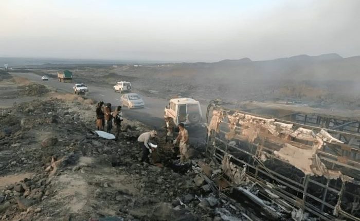 مشاهد صادمة تكشف سبب احتراق حافلة “صقر الحجاز” في أبين “فيديو”