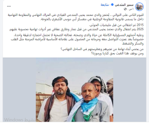 وختم نجل المندعي منشوره متسائلا: “من يحمي أبناء تهامة من تجبر وغطرسة عمار وطارق عفاش، في الساحل التهامي، ومن يوقف هذا العبث بحق كبارنا ورموزنا”، في استغاثة تعكس حجم الاستياء الشعبي من ممارسات الفصائل الموالية للإمارات.