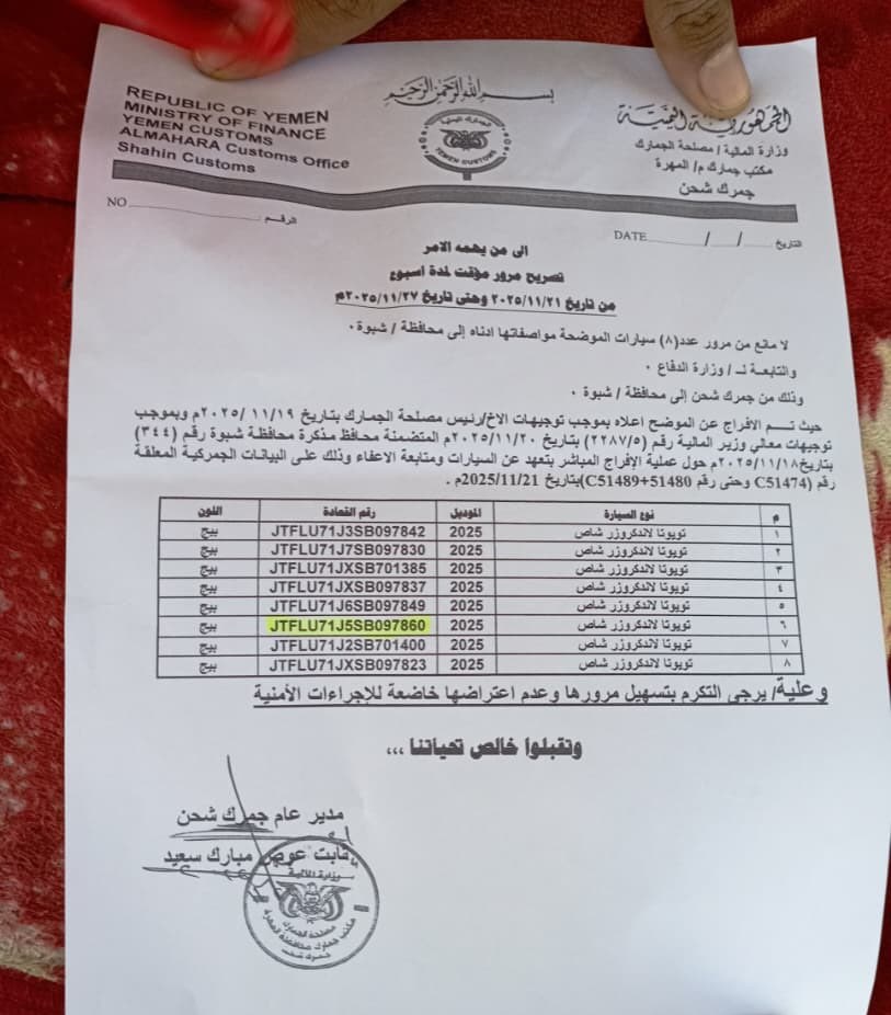 العودة إلى "الإمارات ترسل 394 آلية لفصائل “دفاع شبوة” عبر منفذ شحن الحدودي “وثائق”" الإمارات ترسل آليات منفذ شحن إلى دفاع شبوة 1 التالي السابق