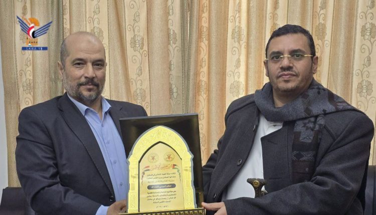 وتسلّم عضو المكتب السياسي لأنصار الله الدكتور حزام الأسد، درع “طوفان الأقصى”، من ممثل الحركة في صنعاء أحمد بركة، عرفانًا بمواقف المكتب السياسي لأنصار الله ودوره في دعم القضية الفلسطينية وإسناد المقاومة الباسلة، ونصرة المجاهدين في غزة.