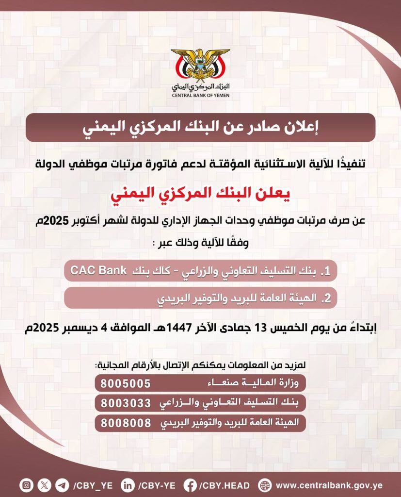 أعلن البنك المركزي اليمني في صنعاء، البدء بصرف مرتبات موظفي وحدات الجهاز الإداري للدولة لشهر أكتوبر 2025م، وذلك تنفيذًا للآلية الاستثنائية المؤقتة لدعم فاتورة مرتبات موظفي الدولة.