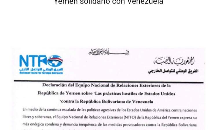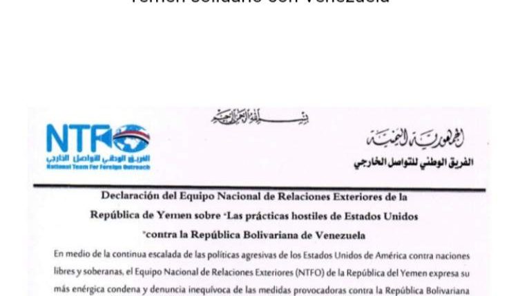 ووصف الموقع الفنزويلي، البيان الأخير الصادر عن الفريق الوطني للعلاقات الخارجية في الجمهورية اليمنية، والذي أدان “الممارسات العدائية للولايات المتحدة ضد فنزويلا”، بأنه “ليس مجرد خطوة دبلوماسية، بل هو إعلان قوي عن مبادئ دولية ويجب على العالم التقدمي أن يصغي إليه ويقتدي به”.