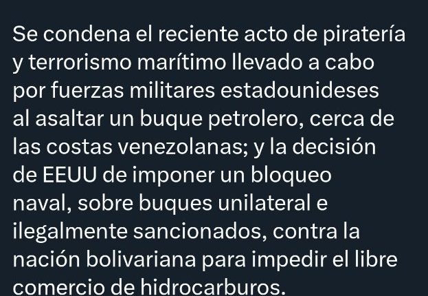 كما أدان قرار الولايات المتحدة بفرض حصار بحري أحادي الجانب وغير قانوني على السفن، في محاولة لعرقلة التجارة الحرة للمواد الهيدروكربونية في فنزويلا.