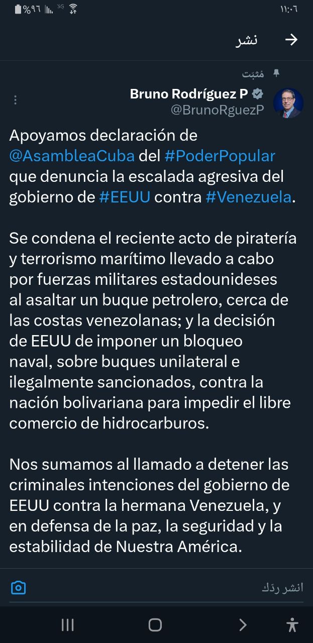 وقال وزير الخارجية الكوبي، برونو رودريغيز،في تدوينة على منصة إكس،:”نؤيد إعلان الجمعية الوطنية الكوبية الذي يدين التصعيد العدواني من جانب الحكومة الأمريكية ضد فنزويلا”.
