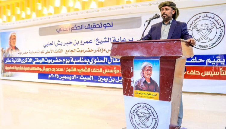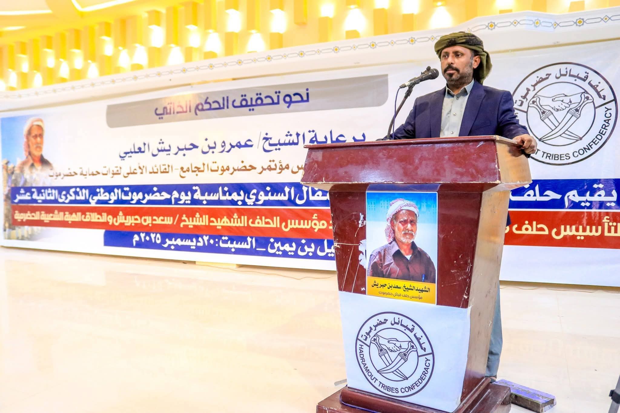 وأضاف بن حبريش، خلال كلمة ألقاها في الاحتفال بالذكرى الـ12 لتأسيس الحلف في مديرية غيل بن يمين، أن الأوضاع في حضرموت “لا تقاس بالأرتال العسكرية والإعلام المغالط”، بل بالنتائج على الأرض التي هي لصالح حضرموت.
