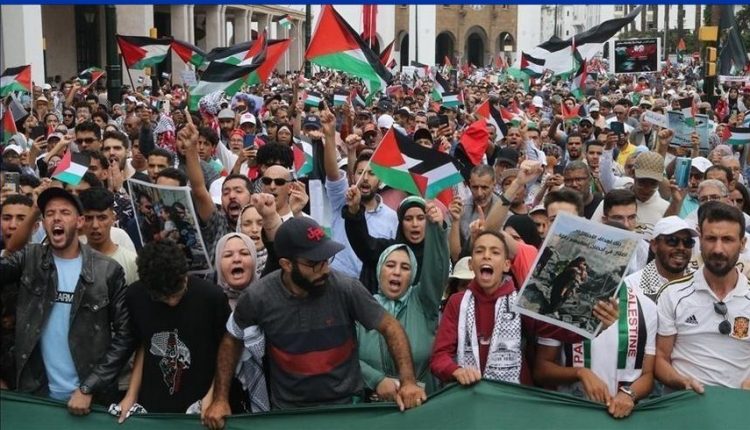 وتجمع المحتجين أمام مبنى البرلمان بالرباط، بدعوة من “مجموعة العمل من أجل فلسطين” (غير حكومية).
