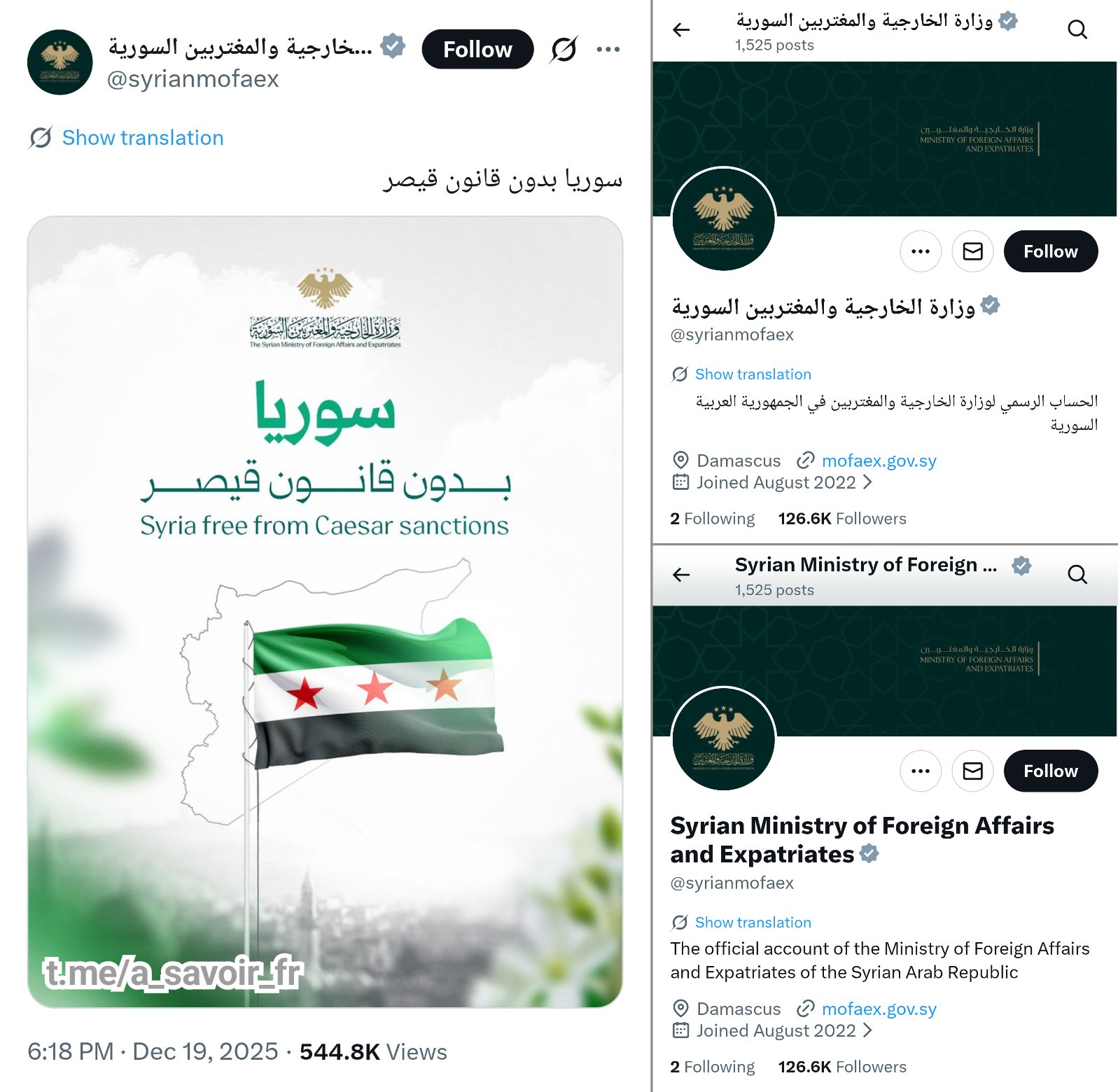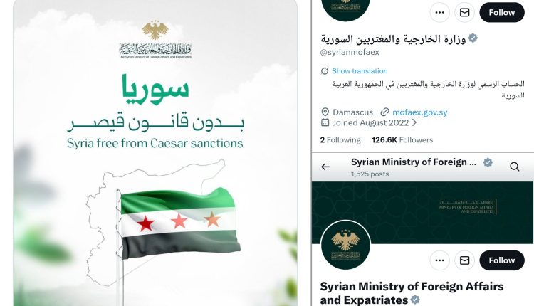 وجاء نشر الصورة في حساب وزارة الخارجية السورية على منصة إكس إحتفاءا برفع العقوبات الامريكية عن سوريا ، وكُتب على الصورة “سوريا بدون قانون قيصر” .