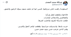 وبين النعمي، أن السعودية، دمرت اليمن واستنزفت ميزانيتها وقطعت أواصر الجوار والقربى”، مختتماً بقوله إن السعودية في نهاية المطاف “خرجت بدون خفي حنين”.