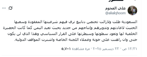 من جهة ثانية، قال عضو المكتب السياسي لأنصار الله، علي القحوم، إن السعودية لا تزال تحتضن ما أسماهم “الدنابيع”، التي ترى فيهم شرعيتها المفقودة، وسعيها الحثيث لإعادتهم وتدويرهم وإنتاجهم من جديد.