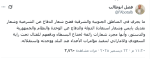 ووصف أبوطالب، في منشور على حسابه في منصة “إكس”، تلك التصريحات بقوله: “مجرد شعارات زائفة لخداع البسطاء ودفعهم للقتال تحت راية السعودي والإماراتي لتنفيذ مؤامرات الأعداء ضد البلد ووحدته واستقلاله”.
