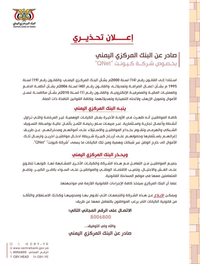 وحذر البنك في البيان، جميع المواطنين من التعامل مع ما يسمى بشركة (كيونت – Qnet) والكيانات الأخرى المشابهة لها، كونها تنطوي على الغش والاحتيال، وتصيب الاقتصاد الوطني والمواطنين على السواء بالضرر الكبير، وتضع المتعاملين معها في موضع المساءلة القانونية.