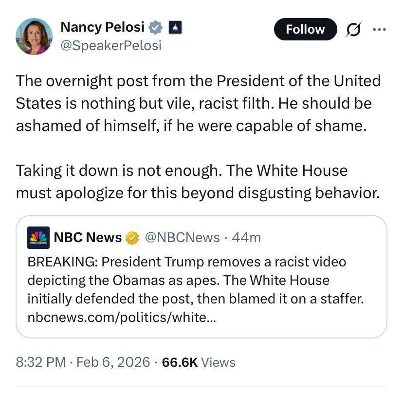 علّقت رئيسة مجلس النواب الأمريكي نانسي بيلوسي على منشور منسوب للرئيس الأمريكي السابق دونالد ترامب، تضمّن إساءة للرئيس الأسبق باراك أوباما وزوجته ميشيل، ووصفت ما ورد فيه بأنه سلوك «مقزز للغاية».