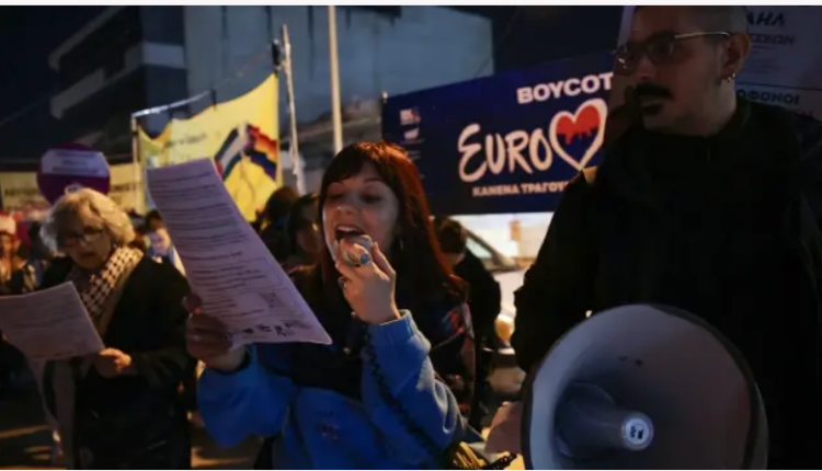 وتجمع أشخاص متضامنون مع القضية الفلسطينية أمام مجمع أثينا للمهرجانات الذي احتضن التصفيات، للتنديد بمشاركة الاحتلال في المسابقة إثر ارتكابها إبادة جماعية في قطاع غزة.