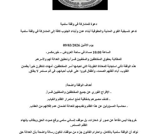 دعت “تنسيقية القوى المدنية والحقوقية”، اليوم الثلاثاء، أبناء مدينة عدن والمحافظات الجنوبية الاحتشاد والمشاركة الواسعة في وقفة سلمية كبرى، يوم الإثنين المقبل في ساحة العروض بمنطقة خور مكسر وسط مدينة عدن.