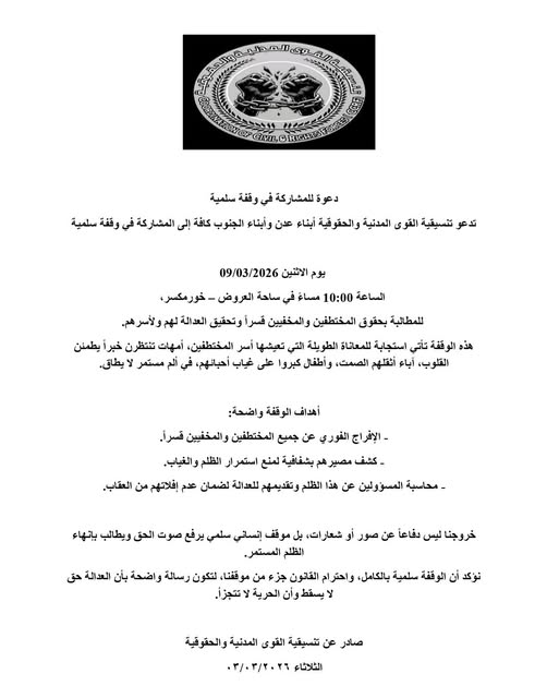 وأوضح البيان أن هذه الوقفة تأتي استجابة للمعاناة الطويلة والقاسية التي تعيشها أسر الضحايا، حيث لا تزال الأمهات ينتظرن خبرا يطمئن القلوب، والآباء أثقلهم الصمت المطبق، بينما كبر الأطفال على غياب أحبائهم في ألم مستمر لا يطاق.
