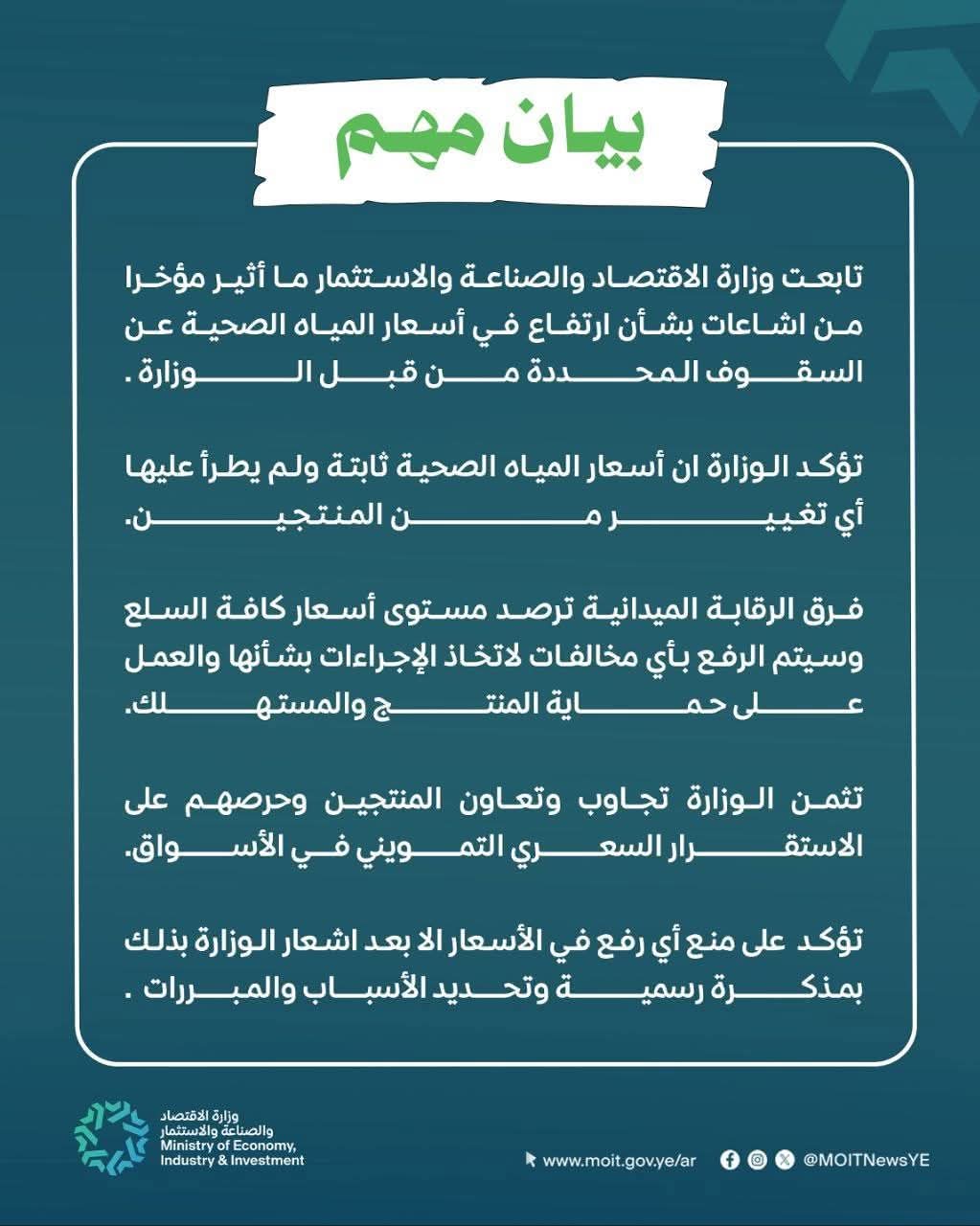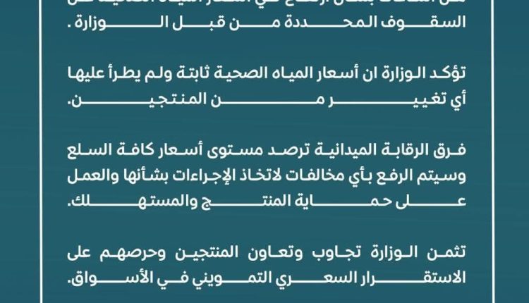 أكدت وزارة الاقتصاد والصناعة والاستثمار بصنعاء، عدم وجود أي رفع في أسعار عبوات المياه الصحية، مشددة على التزام المنتجين بالسقوف السعرية المحددة من قبل الوزارة.
