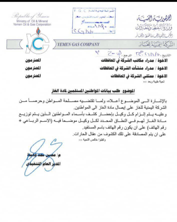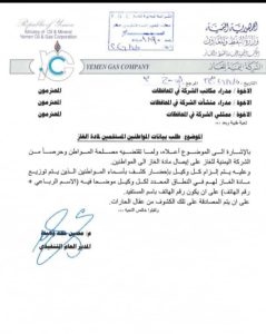 وأصدرت شركة الغاز التي يسيطر عليها الإصلاح، تعميما جديدا موجها لمدراء مكاتبها في عدن وبقية المحافظات الخاضعة لسيطرة القوات الموالية للسعودية، يفرض على وكلاء الغاز وعقال الحارات شروطا ووصفت التجسسية”، مقابل حصول المواطنين على اسطوانة غاز مدفوعة الثمن.