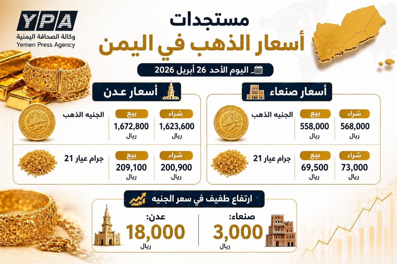 وفيما يلي قائمة بمتوسط أسعار الذهب بأسواق اليمن، الأحد 26 أبريل 2026م